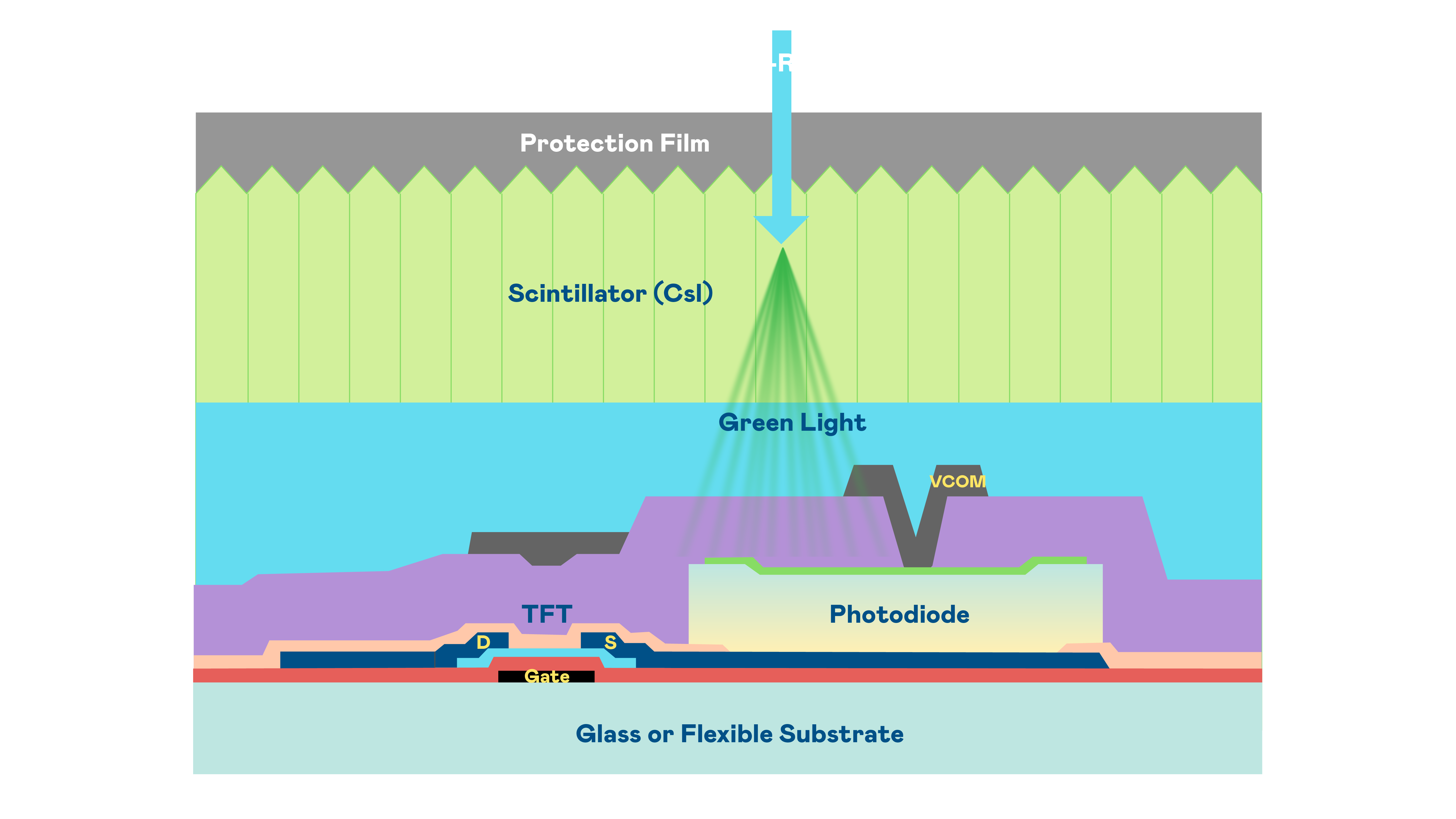 j9九游会首页登录的X光影像感測陣列使用薄膜電晶體 (TFT) 作為每個像素的讀取開關,搭配光電二極體(Photodiode)的光電轉換元件,用以感測X光影像訊號。